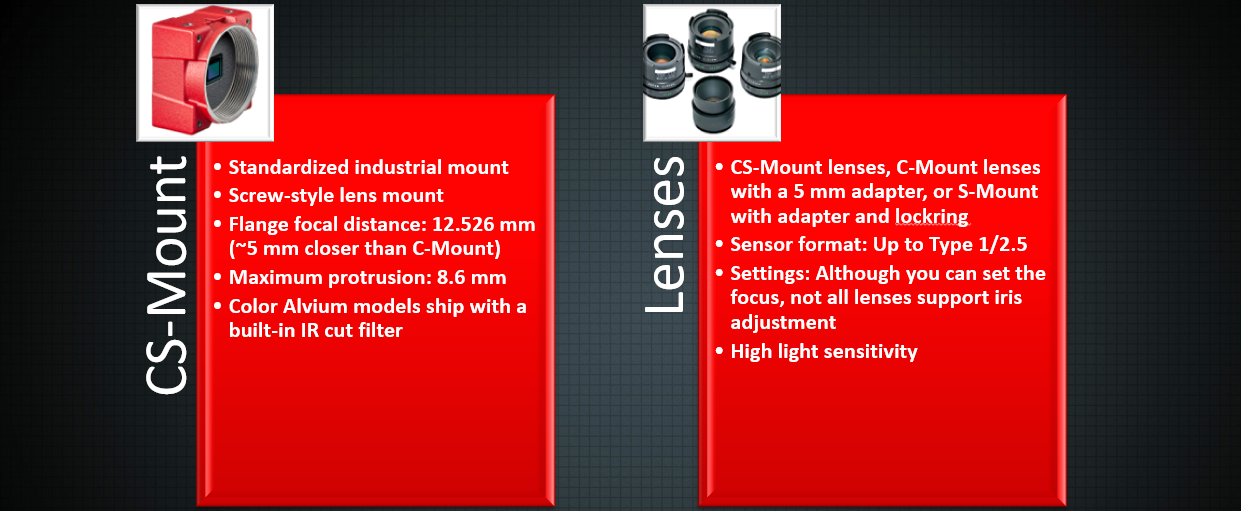 One of your first decisions when selecting a camera for your vision system is deciding on the lens mount. But what are the differences between C-Mount, CS-Mount, and S-Mount. What are the benefits of one lens mount versus another lens mount. Either way, you need a lens mount to attach the lens to the camera. Regardless of the lens mount, every Alvium camera offers the same highly accurate sensor alignment to create crisp images even at the edges.