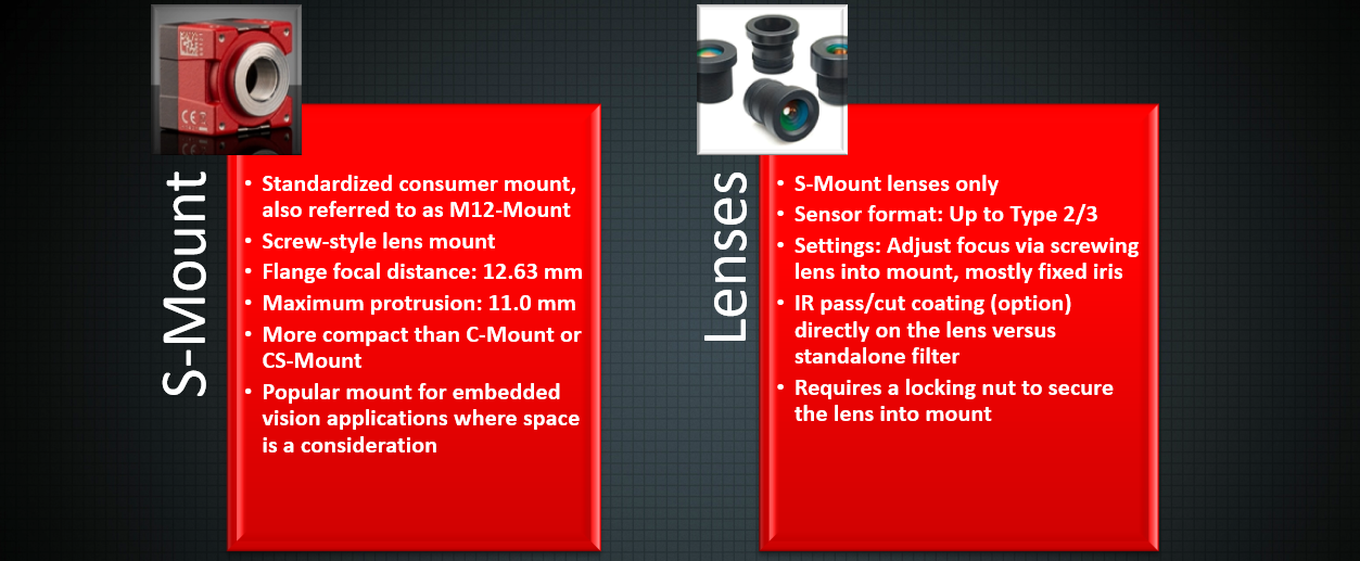 S-Mount is a popular lens mount in embedded vision systems due to its very compact form-factor and inexpensive (good value) lenses. Due to its small size, it is only suitable for sensors up to Type 2/3, although this is also lens dependent. With larger sensors, you will experience vignetting around the edges of the image.