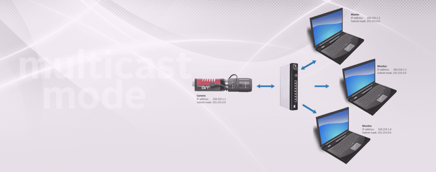 All Allied Vision GigE cameras support multicasting. This feature can be controlled and added to an application using either Vimba, PvAPI, or a third-party SDK. When multicasting is enabled, the camera broadcasts image data to a multicast address. Any device on the same network as the camera can receive multicast image data.