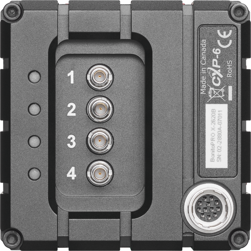 Bonito PRO is Allied Vision’s high-bandwidth camera series with a CoaXPress interface. Equipped with four DIN 1.0/2.3 connectors the camera is capable to transmit 25 Gbps via four CXP-6 high-speed connections. Bonito PRO features a rugged, fanless housing design, and powerful feature set – making it the ideal choice for high-definition imaging applications that require high throughput, robustness, and system design-in flexibility.