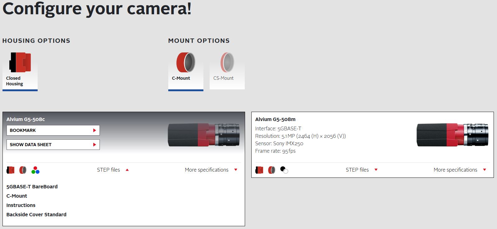 You can download STEP components for Alvium models and Alvium accessories at the Alvium STEP file download page.